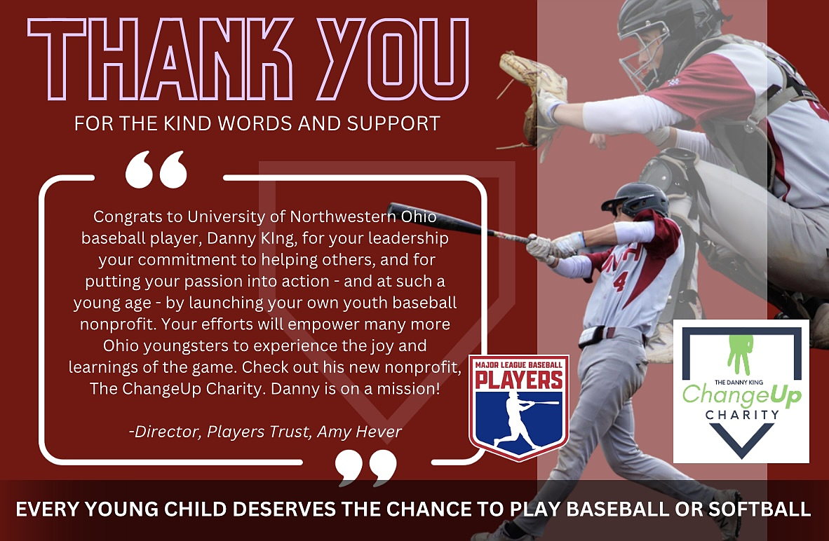 HISTORY: Danny King founded The ChangeUp Charity while attending The University of Northwestern Ohio, where he earned a scholarship as a college catcher. Baseball became an instrumental force in Danny's life, paving the way towards opportunities, scholarships, college offers, travel, friendships, and the important life-lessons only baseball can teach. After playing the game of baseball for over 16 years, he was inspired to begin helping the youth, financially, after recognizing many do not play because they cannot afford it. Because baseball teaches so many life lessons such as leadership, sacrifice, commitment, teamwork, failure and success, Danny and his family wanted to give every youth athlete the chance to explore where participation in the sport can take them. Every young child deserves the chance to play baseball or softball. And to every child, Danny wants the youth to always remember to BELIEVE IN YOURSELF.