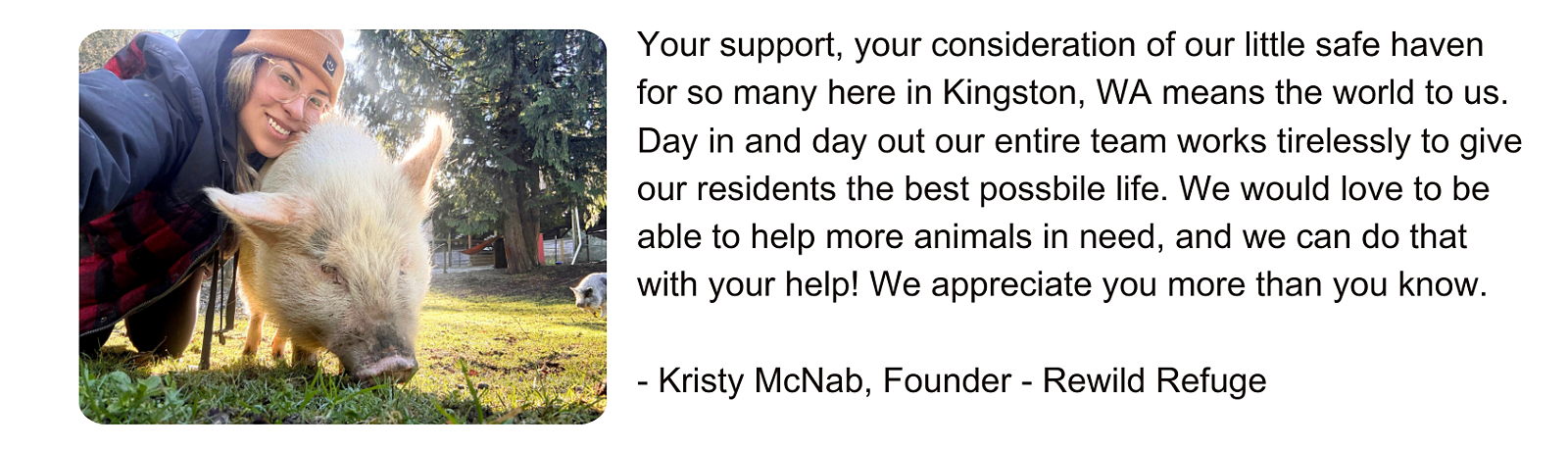 At Rewild Refuge, every animal that comes through our gates carries a story, and together, we get to help write a better ending. Our sanctuary is more than a place to live; it's a lifetime commitment to every soul in our care, and a commitment to giving them the best life possible. When you support Rewild, you're not just helping animals heal — you're helping build a community where people reconnect with compassion, with nature, and with each other. Every gift matters. Thank you for being part of our story!