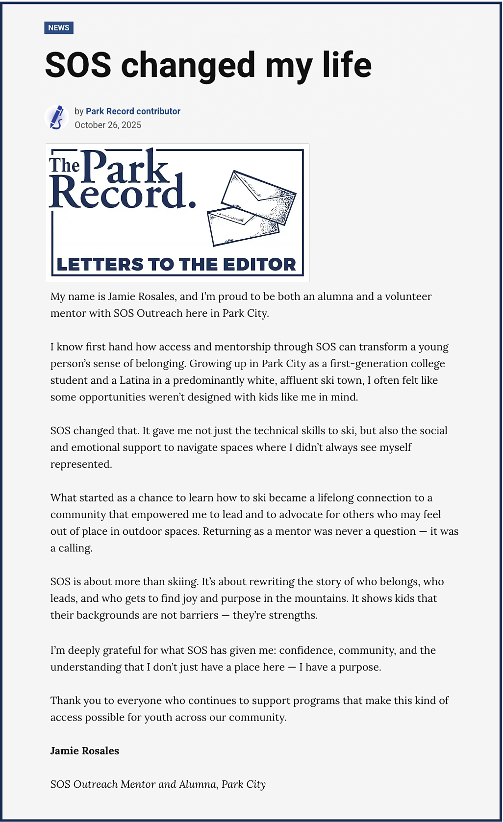 SOS Outreach is a local mentorship nonprofit that harnesses the power of skiing and snowboarding to support more than 600 youth in Park City. At the heart of SOS, we create belonging, opportunity, and community through the joy of the mountains and the transformative power of mentorship.