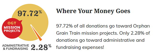 "In loving response to Christ, the Servant, the Orphan Grain Train movement encourages and enables God's people to share personal and material resources in bringing Christ's name and character to NEEDY PEOPLE, both far and near. Sometimes that character expresses itself as a word well-spoken, sometimes as a bandage well-applied, and sometimes as a child well-fed."