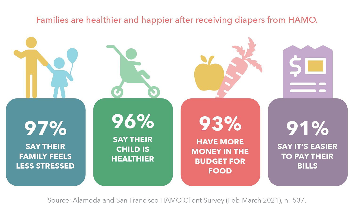 Help a Mother Out® works to improve baby and family well being by increasing access to diapers for families in need. Our vision is a day when every baby has a healthy supply of diapers.