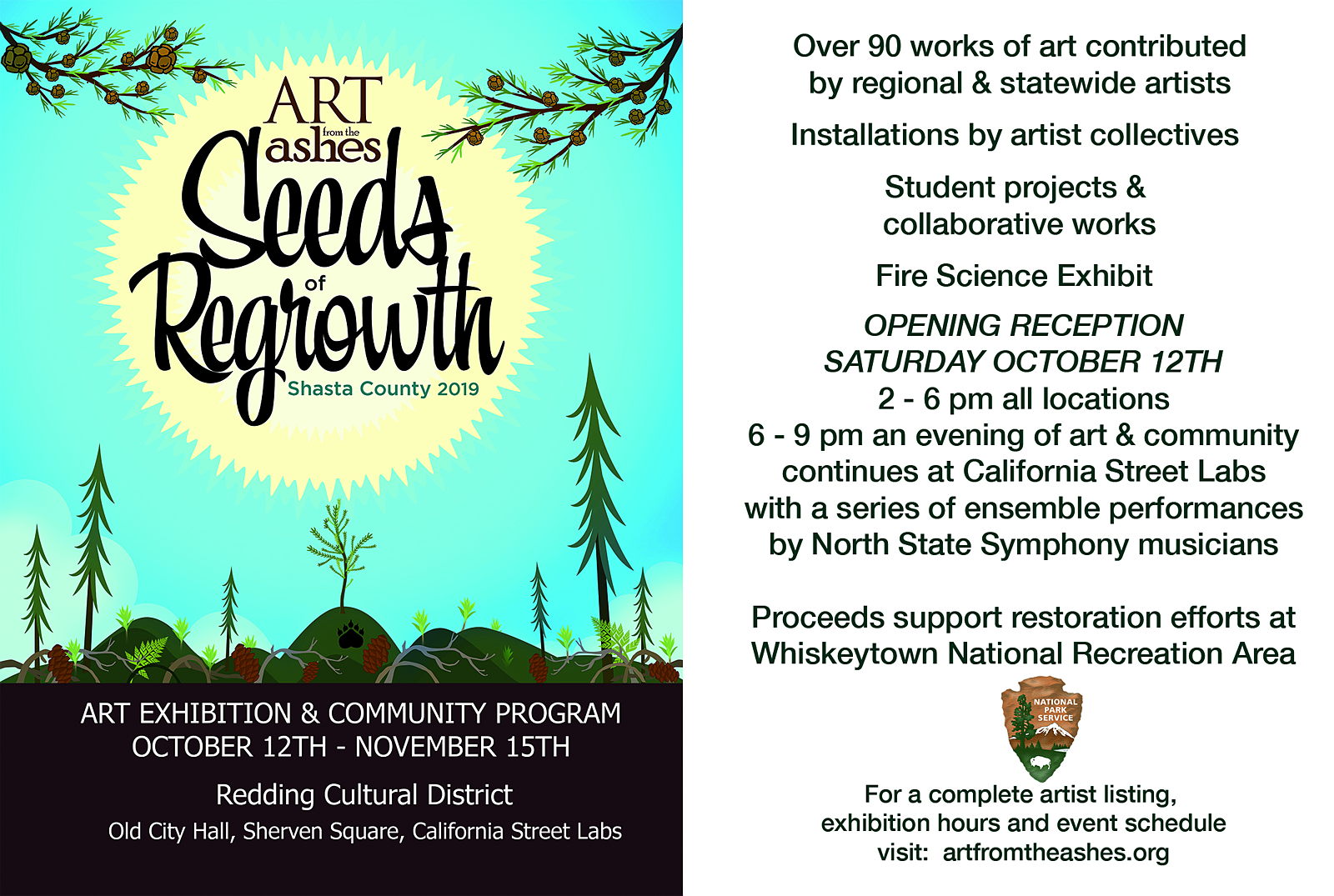 The Fall of 2019 programming will include a large scale art exhibition and special event programs. Proceeds and donations will support restoration efforts at Whiskeytown National Recreation Area.