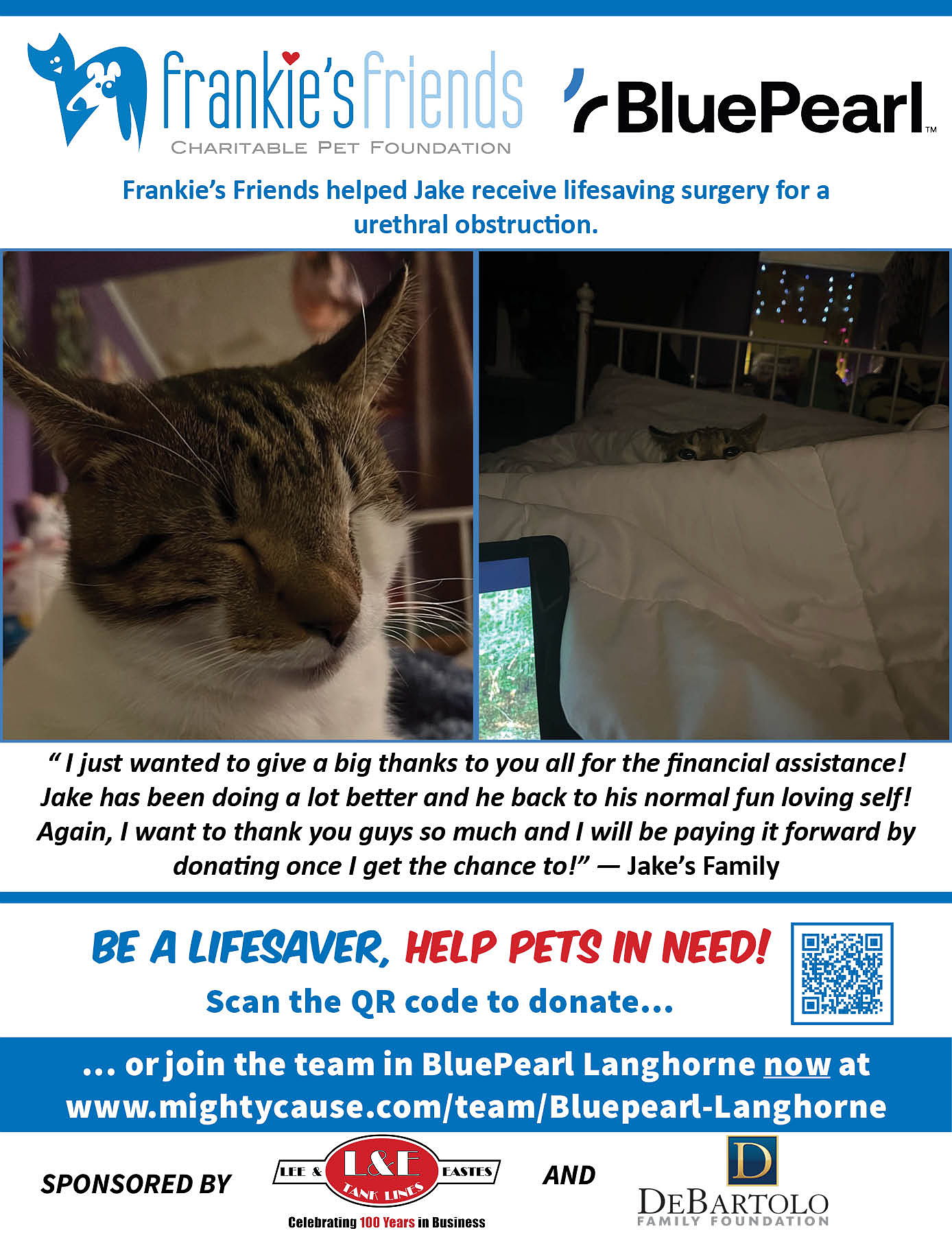BluePearl Veterinary Partners is proud to support the work of Frankie's Friends by participating in Paws for a Cause to help family owned pets in need of lifesaving veterinary care their owners can't afford. Will you help us?