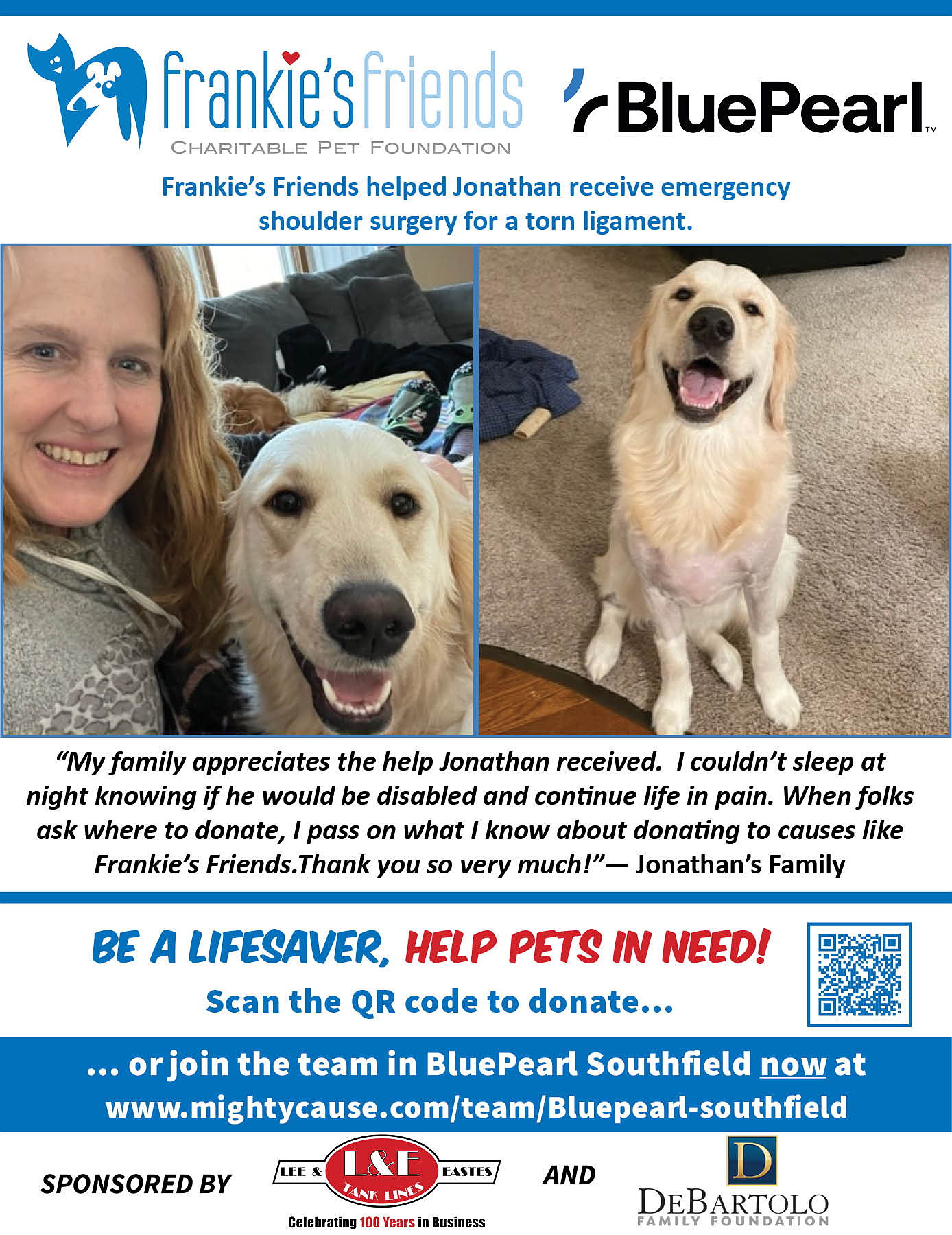 BluePearl Veterinary Partners is proud to support the work of Frankie's Friends by participating in Paws for a Cause to help family owned pets in need of lifesaving veterinary care their owners can't afford. Will you help us?